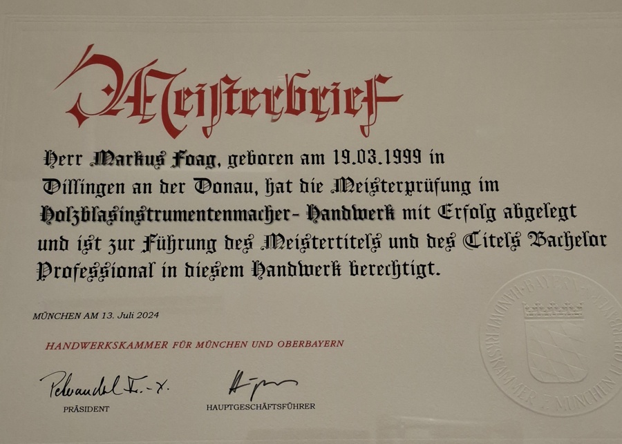 Ausbildungsstart für 1. Lehrling zum Holzblasinstrumentenmacher